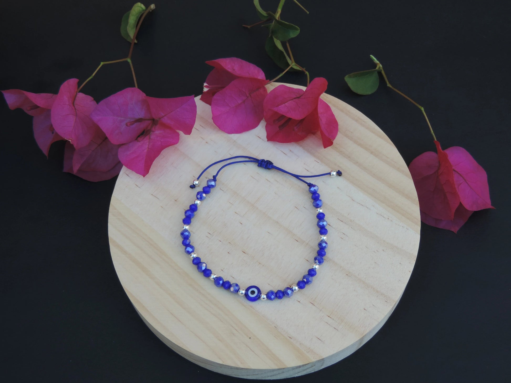 Materials include 925 Silver beads, dark blue crystals, and an evil eye bead